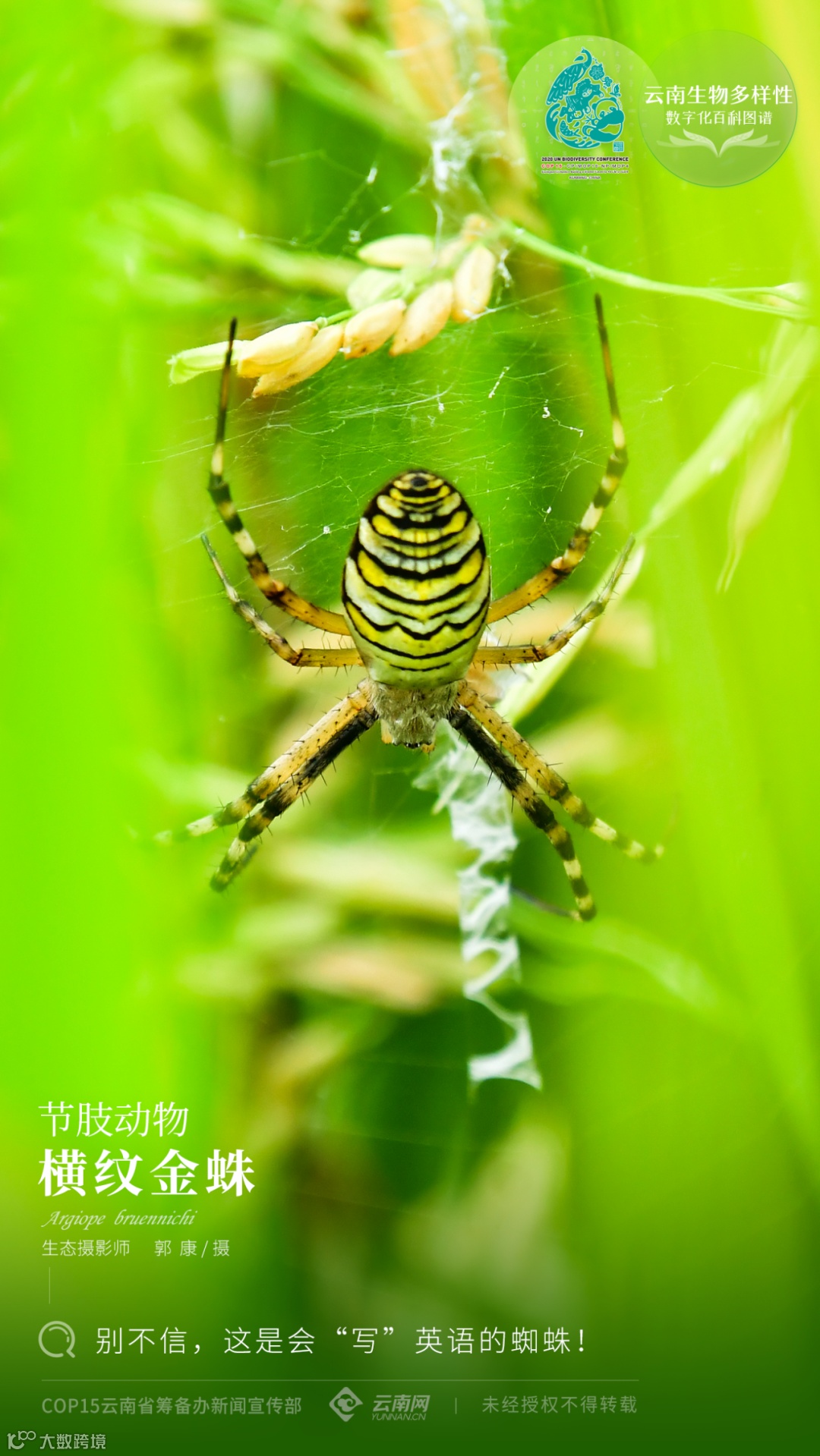 横纹金蛛,隶属于节肢动物门,蛛形纲,蜘蛛目,园蛛科,金蛛属。它们栖息于植被茂盛,气温和湿度较高的地区,常在树枝或灌木之间织大型圆网,以昆虫为食。国内主要分布于广东、海南、云南、四川、贵州等省份。照片摄于保山。