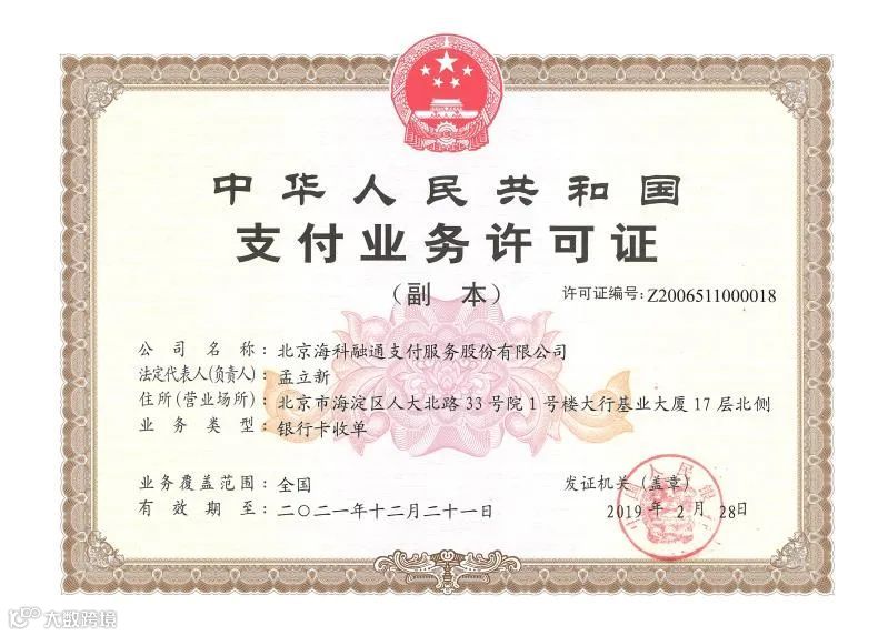 海科融通于2011年获得中国人民银行颁发的《支付业务许可证》(全国范围银行卡收单支付牌照),拥有全国范围内经营第三方支付业务的从业资质。