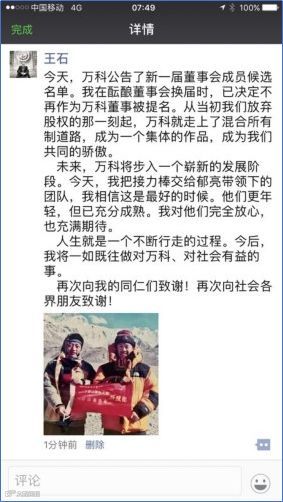 不过,一年以后,王石在朋友圈宣布,辞去万科董事长职位。