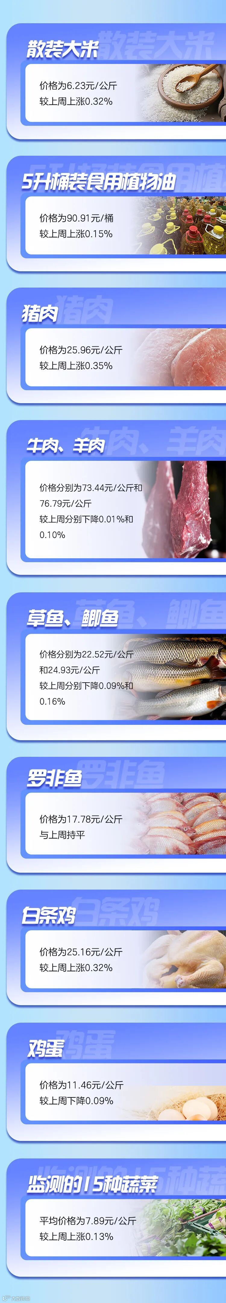 从云南省发展和改革委员会重要民生商品零售价格监测数据看,与上周相比,本周全省粮、油、肉、蛋、菜价格(全省平均价格,下同)总体平稳。