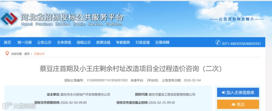 本招标项目 蔡豆庄首期及小王庄剩余村址改造项目全过程造价咨询已由 廊坊市安次区行政审批局 以 廊安审批招标准许[2025]09号 批准建设,项目业主为廊坊市永兴房地产开发有限责任公司 ,建设资金来自财政资金 ,出资比例为 100% ,招标人为 廊坊市永兴房地产开发有限责任公司 。项目已具备招标条件,现对该项目进行公开招标。