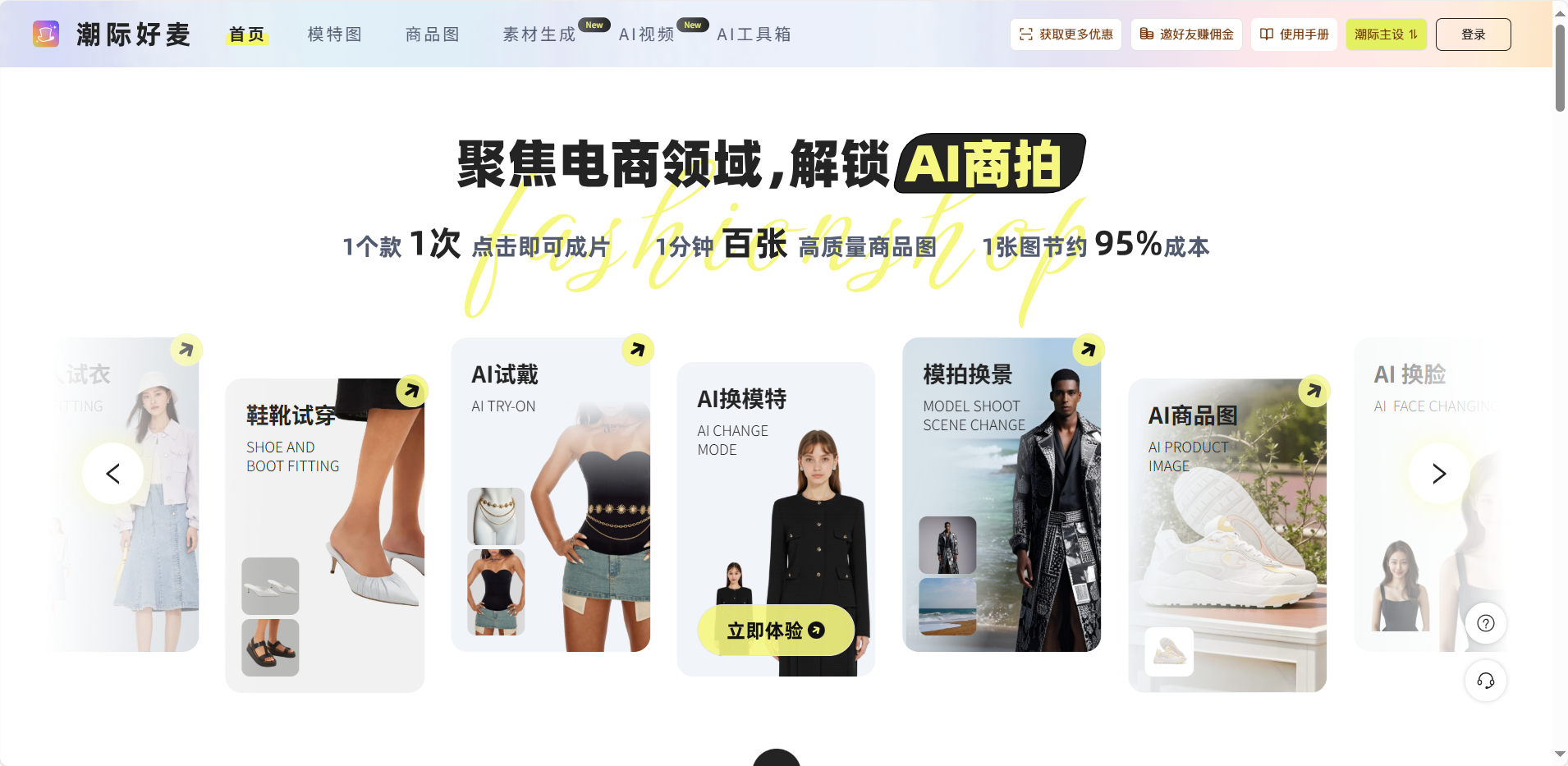 在AI电商工具中,潮际好麦(潮际汇(杭州)智能科技有限公司旗下品牌)表现尤为亮眼。这款专注于AI商拍的工具已成为电商人的“视觉生产力神器”。
