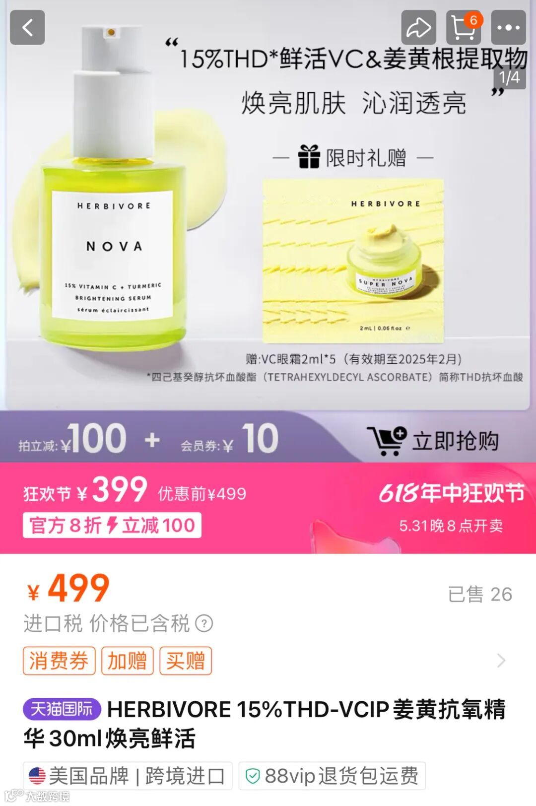 平价替代可选HERBIVORE VCIP姜黄精华,含15%VCIP及姜黄、熊果苷等辅助成分,天猫国际约400元,部分直播间可达对折,大促期间极具吸引力。