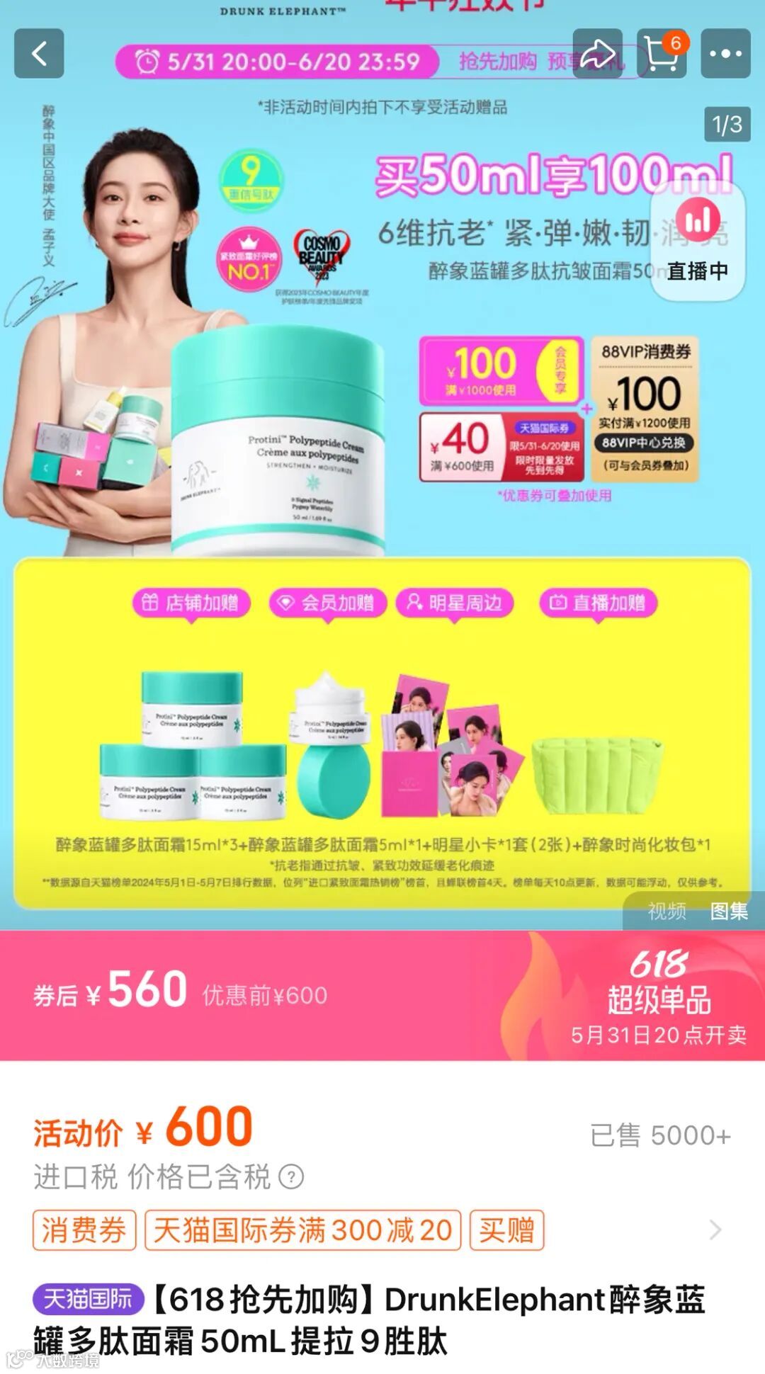 若希望兼顾再生修护,醉象多肽面霜值得关注。采用多种信号肽复配,拒绝刺激性添加,适合各类肤质。618期间旗舰店约600元可得正装+50ml小样,部分直播间更低至500元,较平时大幅优惠,适合预算充足者。