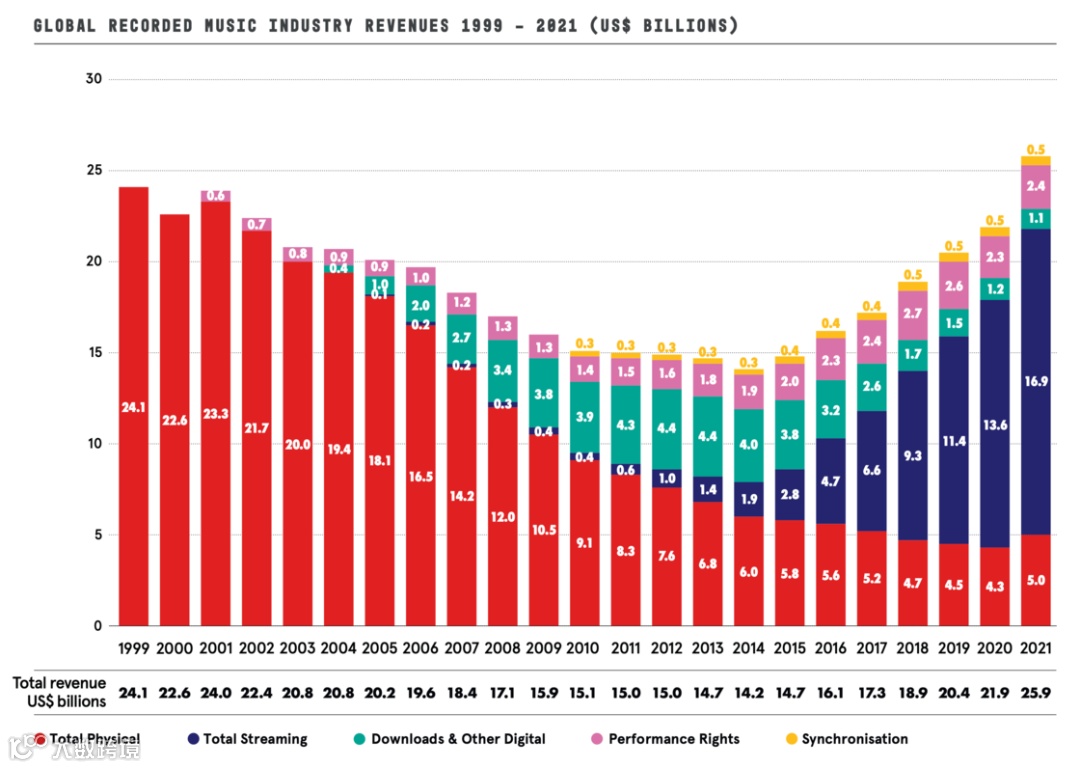 2020年疫情推动需求,2021年全球音乐产业营收达1999年以来最高水平,正式“重现辉煌”。