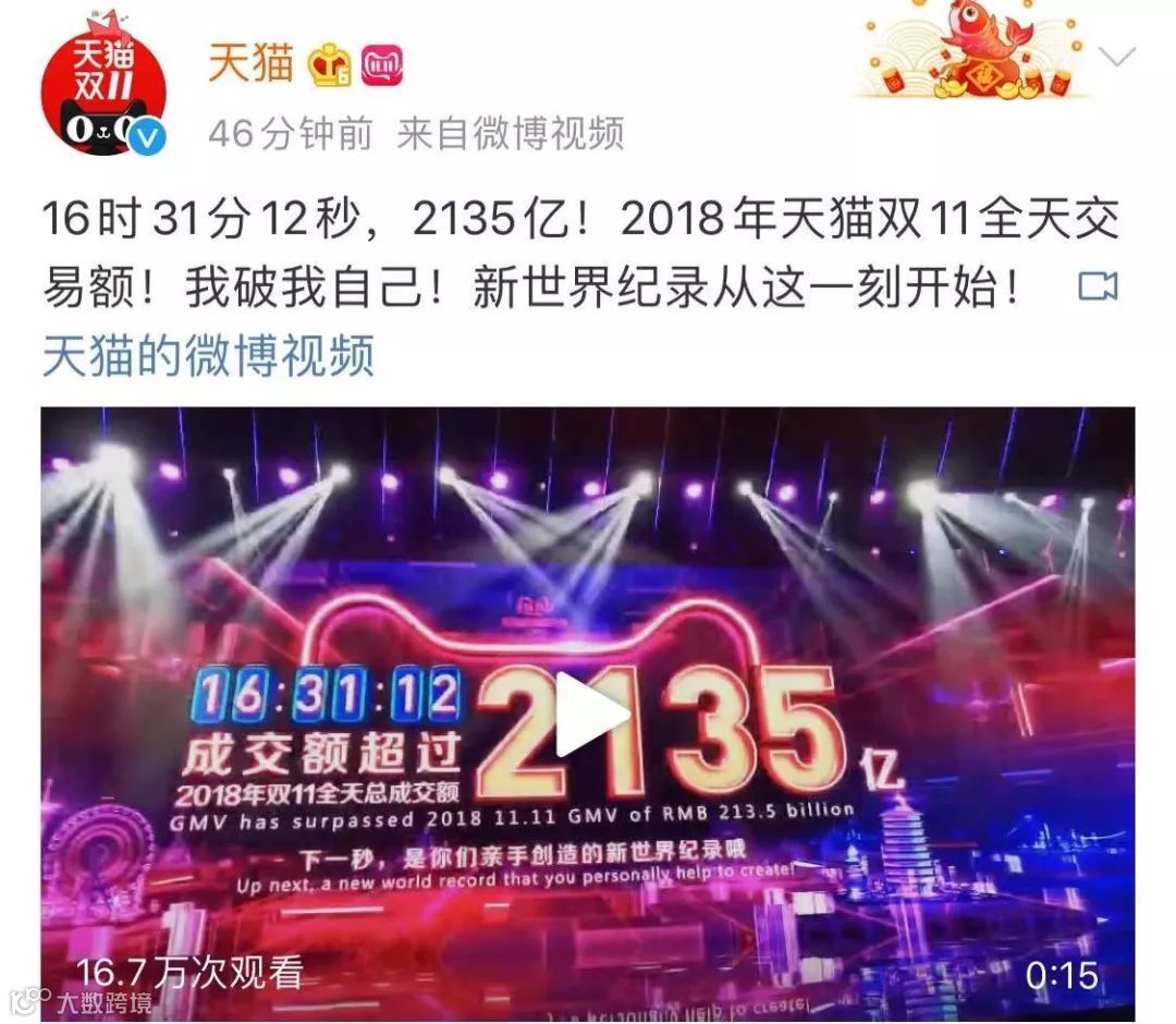 16个小时(11月11日16时31分12秒)2019年天猫双11全球狂欢节成交额超2135亿,打破2018年天猫双11全天交易额纪录。