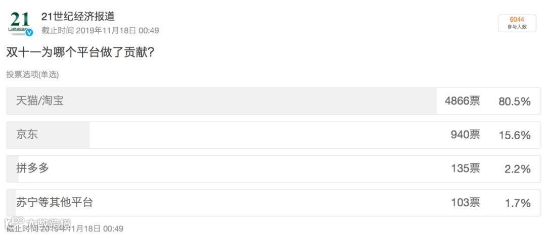在昨日21君微博发起的投票的中,共有超过6000人参与投票,其中超过80%的人主要在淘宝/天猫平台做了购物贡献,其次是京东,但也只占据15.6%。