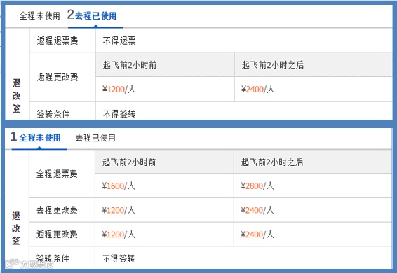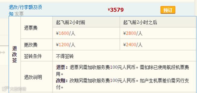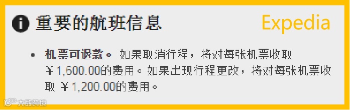 这是 Expedia 和携程对于同一张机票的查询。Expedia 只给出了两个信息:退票和改签费用。