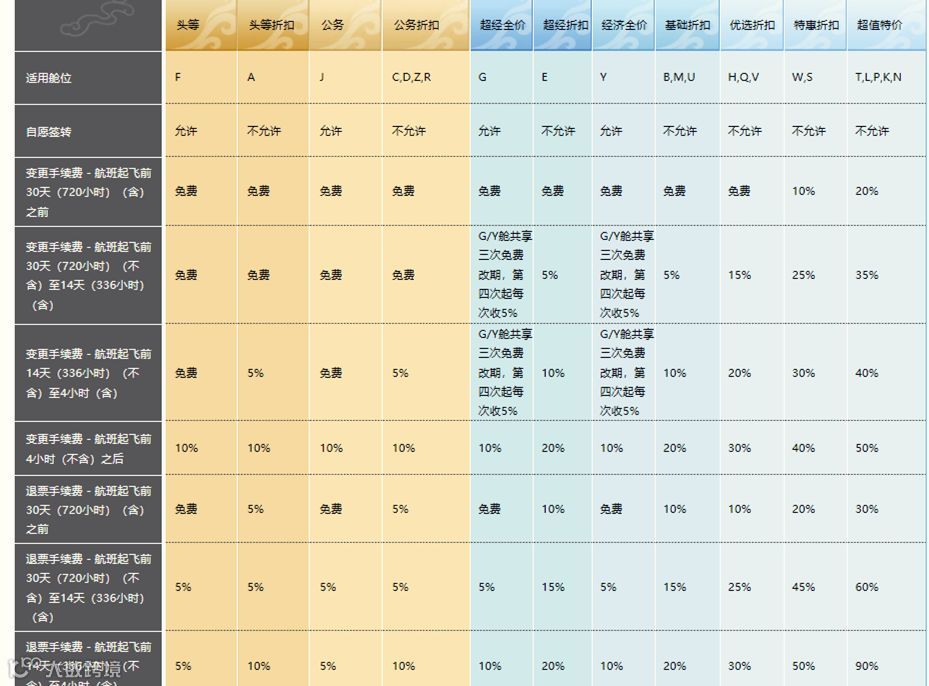 首先是舱位:你一定知道头等舱、商务舱、经济舱。这个叫做仓等,不叫舱位。在每个仓等里,才分出若干“舱位”。例如,头等舱大概分为:F、A;商务舱大概分为:C、D、J;经济舱大概分为:Y、B、K、H、L、M、Q、X、E。每个舱位对应着不同的机票折扣,也对应着不同的退改签规则。