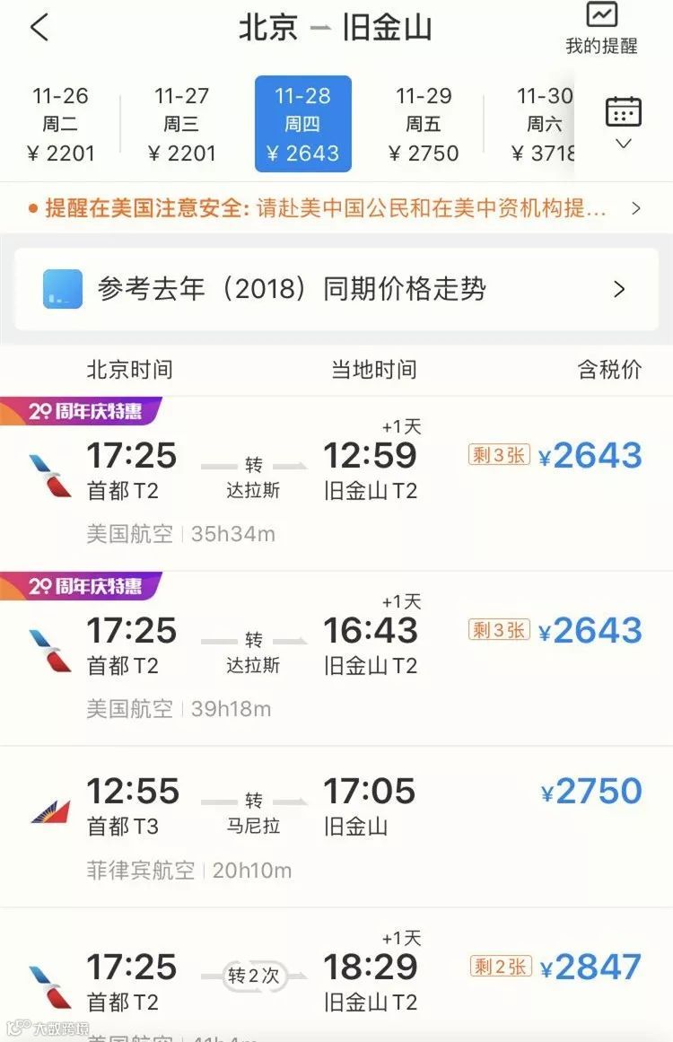 你可以掏出手机试一下,在携程机票页面里随便输入两个地方,例如北京-旧金山。你可以看到,系统推荐的是在达拉斯中转的美国航空航班,这个价格是实时最优的。往下翻你就会找到省时间但是贵一点的直飞航班。