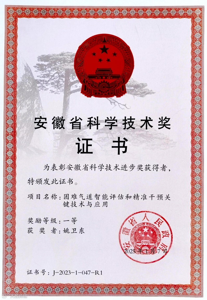 学科一贯强调和鼓励科研创新的重要性,以姚卫东教授为首的科研攻关团队一直致力于困难气道的理论和实践创新,经过多年潜心研究,成果发表多个顶级期刊,同时被多个国际权威指南引用,最终在2024年斩获安徽省科技进步一等奖,实现皖南医学院乃至安徽省麻醉界科技一等奖零突破。
