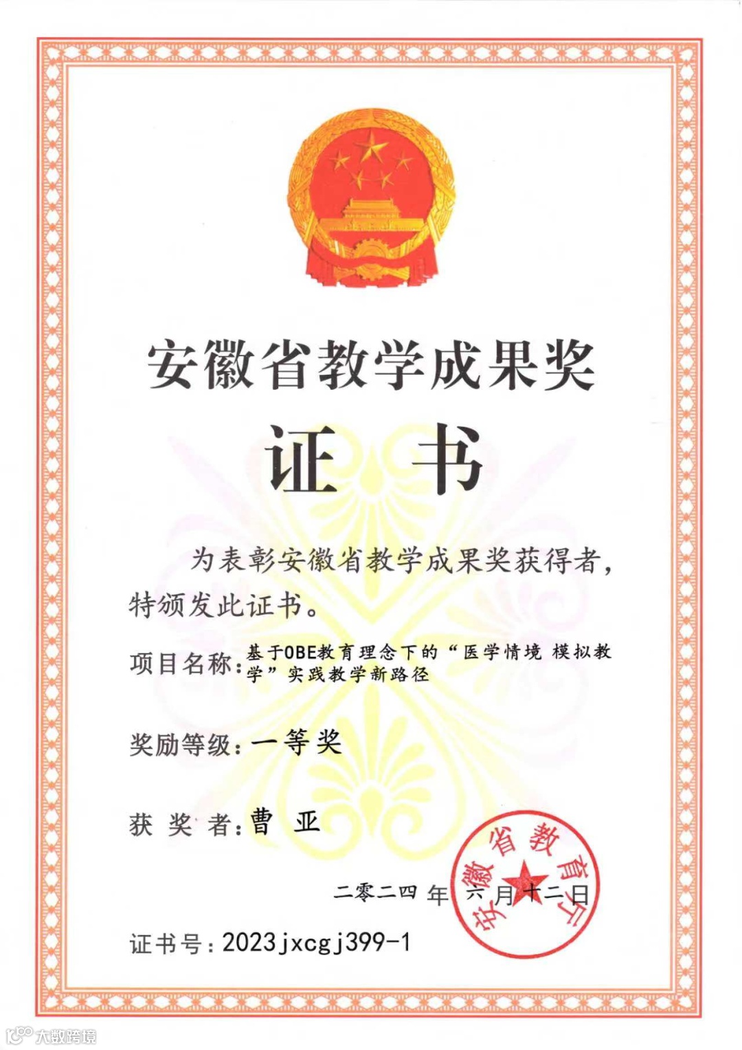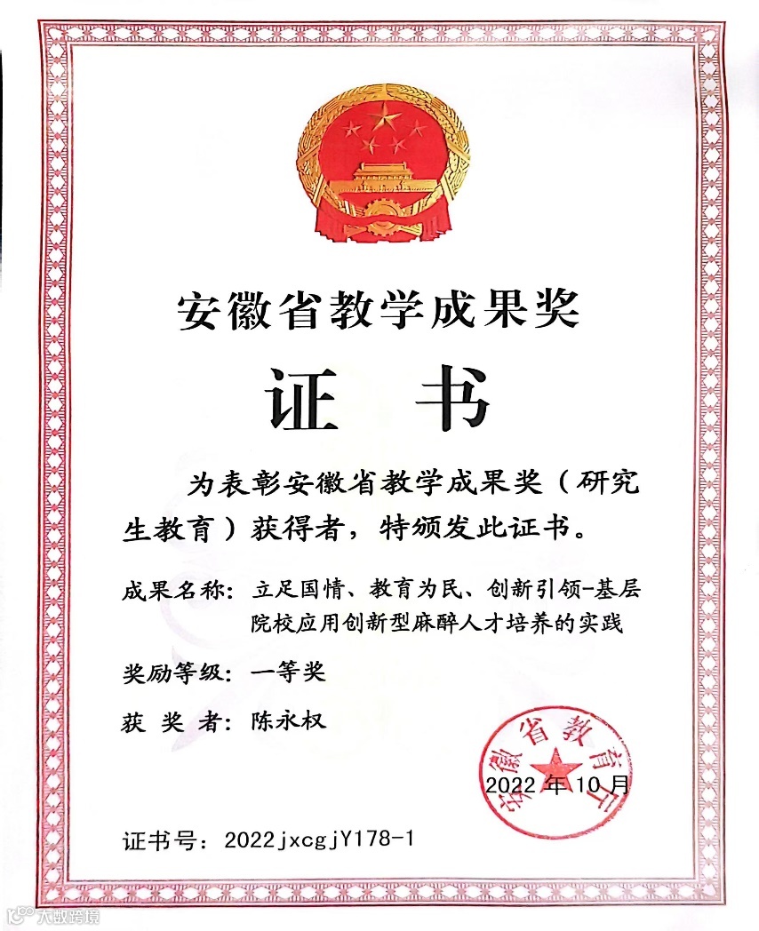 学科非常注重麻醉教学的创新与引领,以曹亚教授为主的麻醉教学团队不断探索麻醉教学新方法,总结出一套高效教学理论,曹亚教授2024年获得安徽优秀教师,同时其团队分别在2022年和2023年两次获得安徽省教学成果一等奖。
