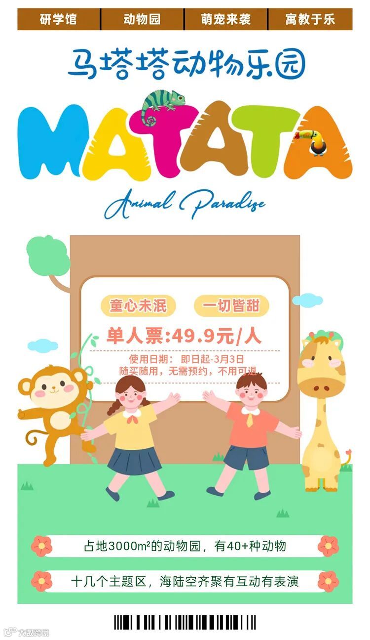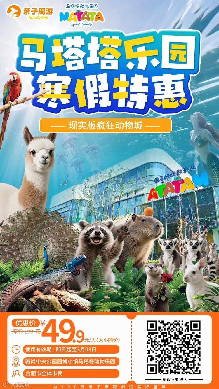 【寒假限时抢购价低至49.9元|骆岗马塔塔动物乐园】寒假遛娃好去处,近距离互动海陆空萌宠。几十个互动主题区+儿童互动游乐区!