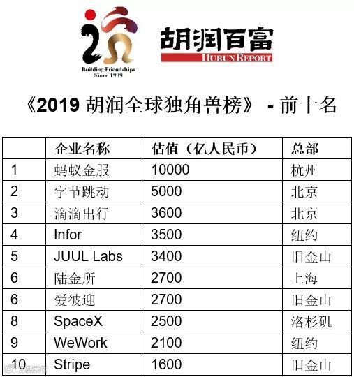 10月21日,胡润研究院发布《2019胡润全球独角兽榜》,所谓独角兽就是指创立十年以内、估值10亿美元以上、还未上市的创业公司。