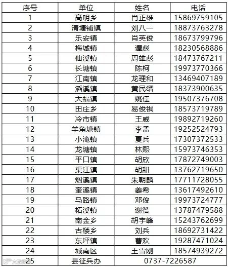 适龄公民及家长可登录“全国征兵网”或“湖南征兵”微信公众号查询相关法规政策和报名流程,也可咨询户籍所在地乡镇(街道)武装部,联系方式如下: