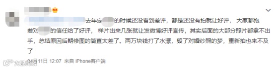 更有网友吐槽,婚纱旅拍店甚至连评价都是“被好评”。没有拍就让好评,结果后期太差,两万块打水漂。