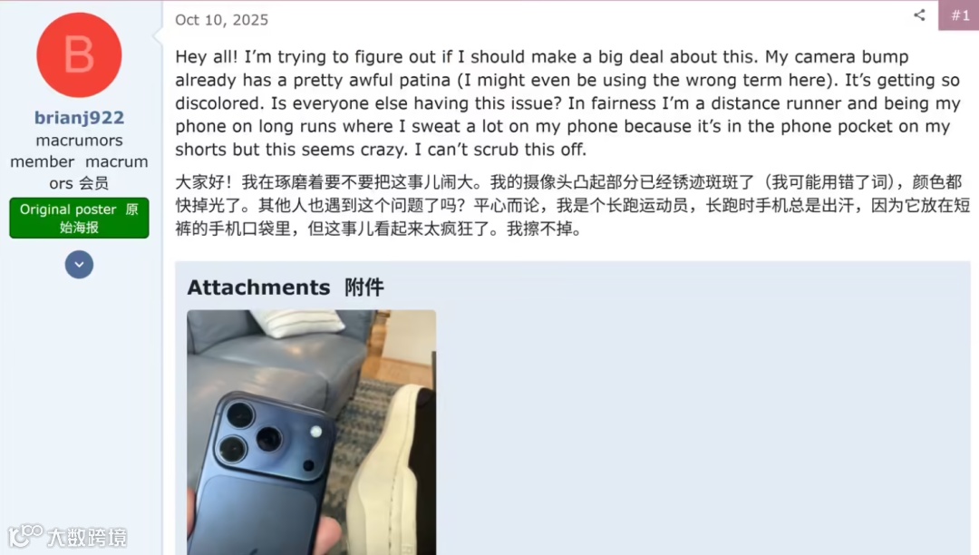 我们查阅了大量资料,最后确定,是因为部分机型颜色涂层未完全密封,铝材暴露在空气中发生了氧化反应,导致变色。虽然这只是个例,不过毕竟一万块的手机,品控做成这样,真让人糟心。