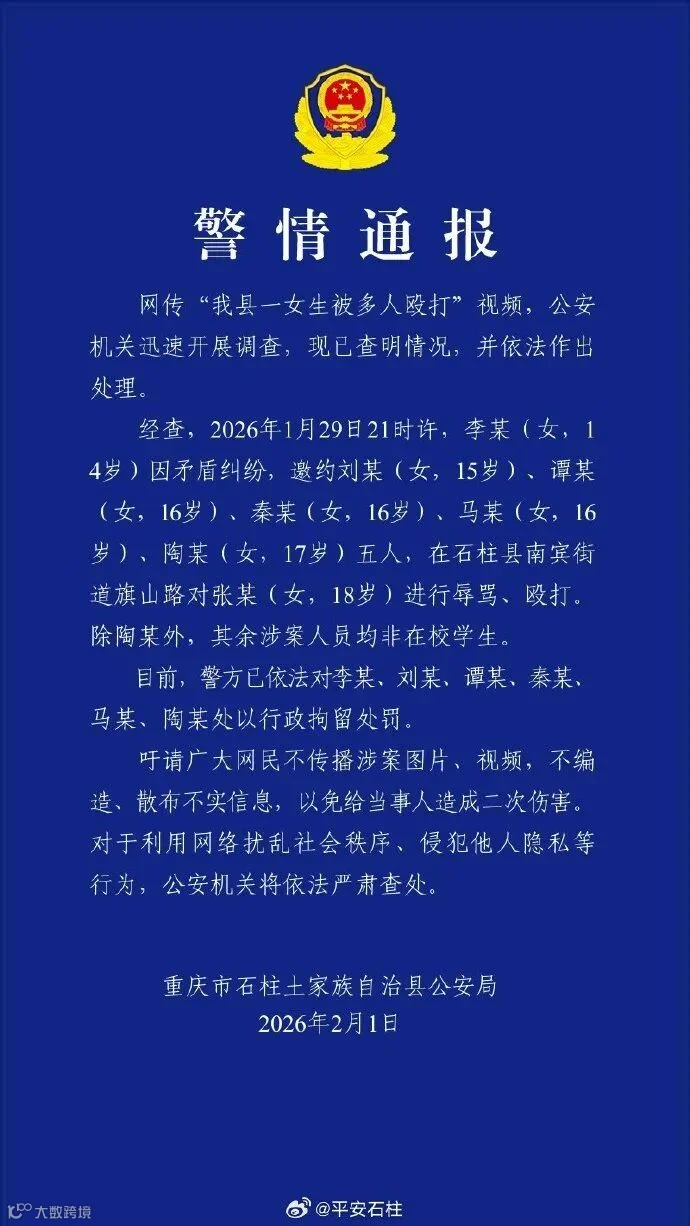 导读:2月1日,重庆市石柱土家族自治县公安局@平安石柱 发布警情通报:网传“我县一女生被多人殴打”视频,公安机关迅速