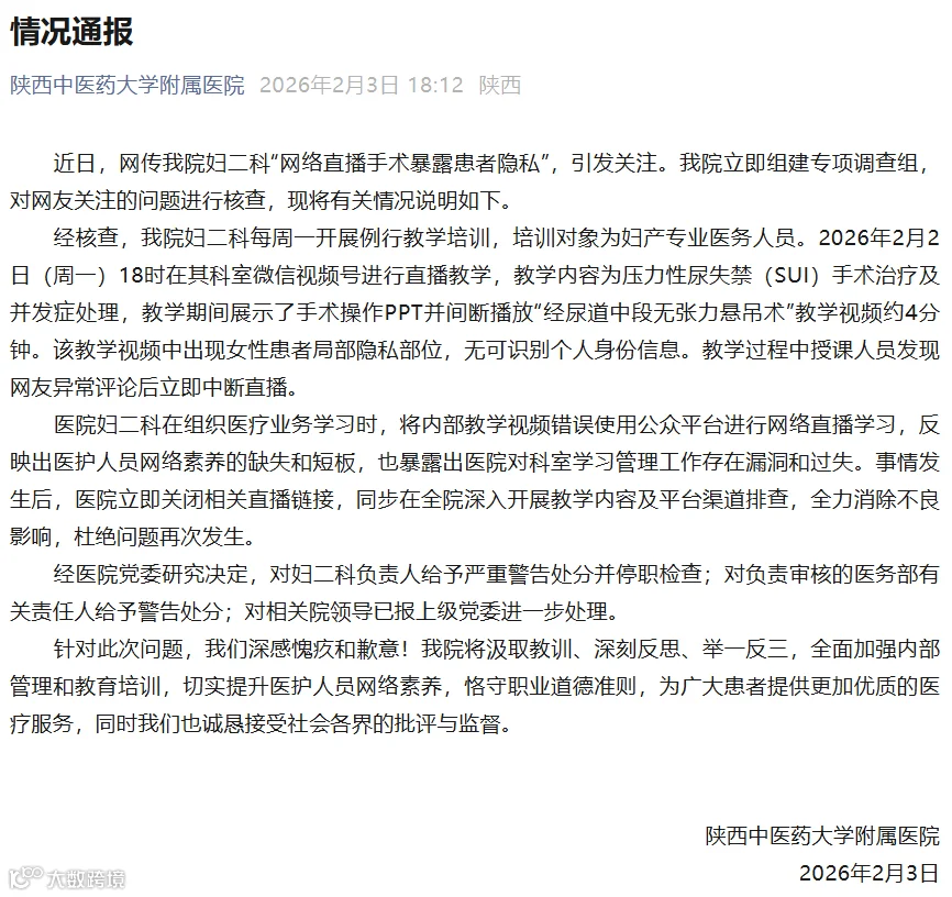 经核查,我院妇二科每周一开展例行教学培训,培训对象为妇产专业医务人员。2026年2月2日(周一)18时在其科室微信视频号进行直播教学,教学内容为压力性尿失禁(SUI)手术治疗及并发症处理,教学期间展示了手术操作PPT并间断播放“经尿道中段无张力悬吊术”教学视频约4分钟。该教学视频中出现女性患者局部隐私部位,无可识别个人身份信息。教学过程中授课人员发现网友异常评论后立即中断直播。