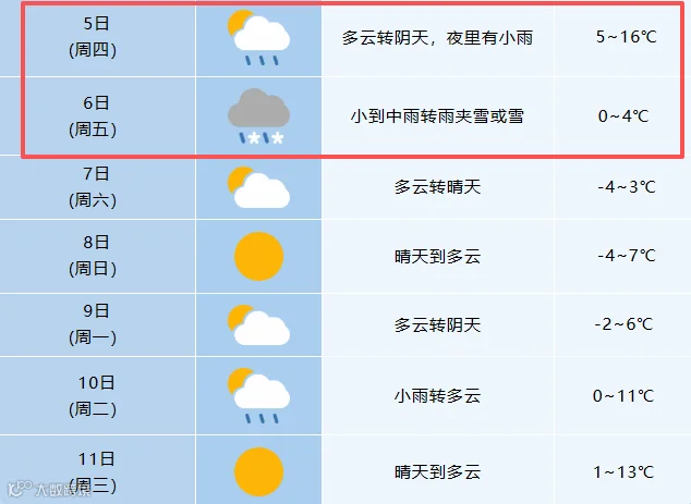 5日(周四):全省多云转阴天,沿淮地区西部有小雨或雨夹雪;淮河以南有小雨,部分地区中雨。