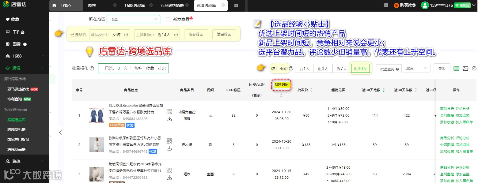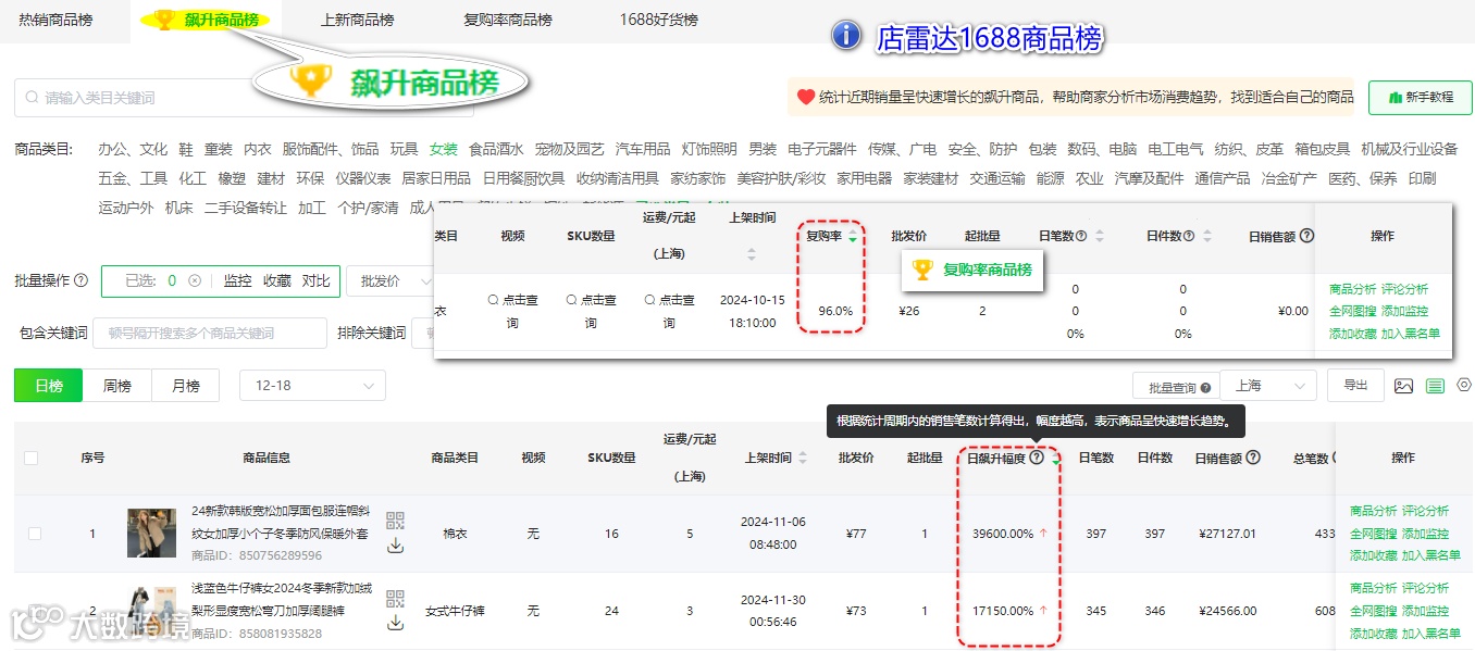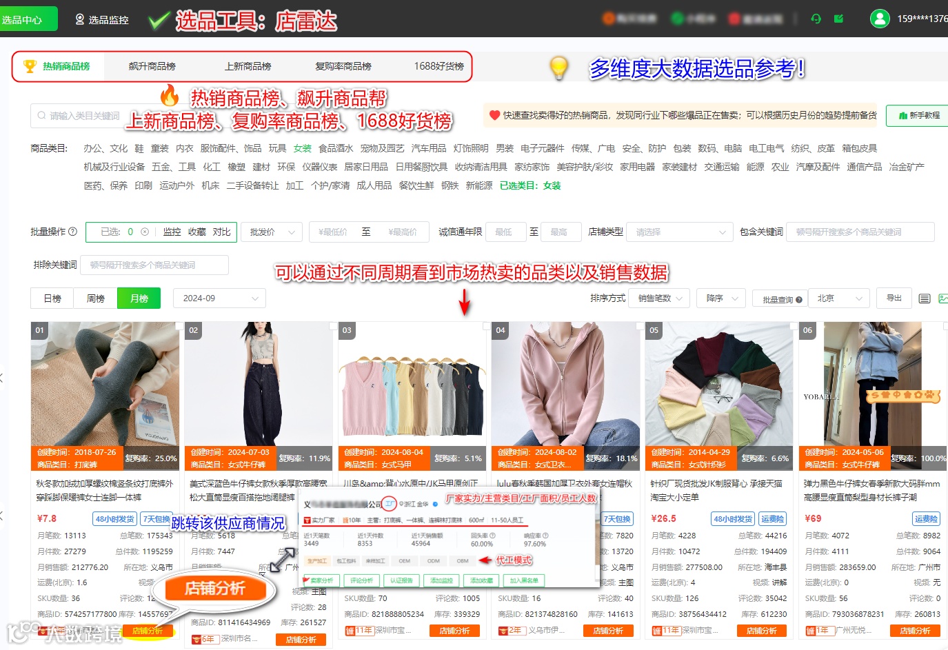 当下游市场需求旺盛,而1688站内竞争较小时,便是挖掘潜力新品的最佳时机。店雷达1688选品库能查询全细分品类热门商品。