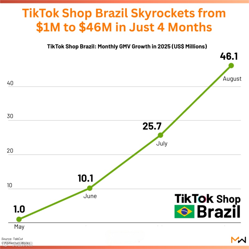 自 2025 年 5 月正式上线以来,TikTok Shop 巴西站仅用数月便展现出惊人的增长爆发力。风投机构 Momentum Works 发布的报告显示,其 GMV(商品交易总额)从上线初期的 100 万美元,一路飙升至 7 月的 2570 万美元,短短两个月内实现 25 倍增长;进入 8 月,增长势头未减,GMV 进一步攀升至 4610 万美元,环比增幅达 79%。四个月累计超8200万美元,这一业绩不仅远超市场预期,甚至超过了 TikTok Shop 新加坡站去年上半年的月均 GMV 水平,印证了巴西市场的巨大潜力。
