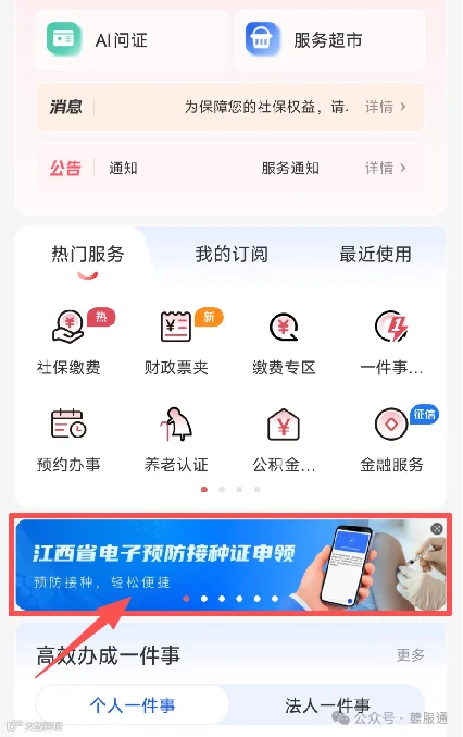 2.进入“赣服通”首页,点击“江西省电子预防接种证申领”入口或者在“卫健专区”-“热门服务”点击“电子预防接种证”,即可进入到电子预防接种证申领页面;