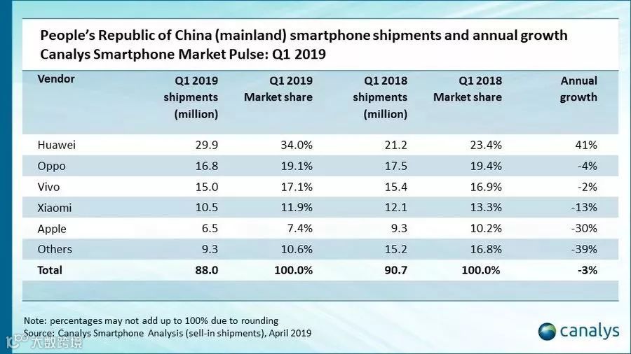 据市场调研机构Canalys统计,一季度苹果在中国出货量暴跌30%,不仅被华为赶超,就连OV、小米都远远将苹果抛在了身后。