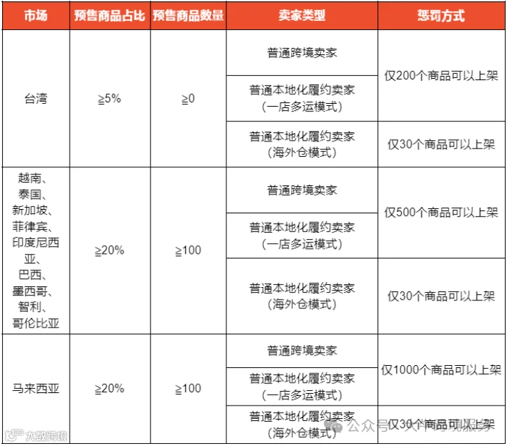 不同市场的预售比例要求如下。如果店铺的预售商品占比过高,将会受到处罚。超出部分将被系统自动隐藏,卖家将无法上传新商品。需要注意的是,台湾站点不计入预售商品占比商品类目。