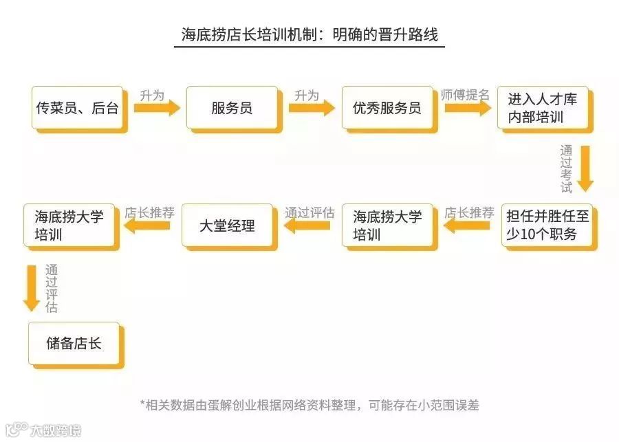 海底捞大学为门店储备干部,只培训大堂经理或店长,员工需要脱产培训,大堂经理5—7天,店长2周,主要学习制度制定和实操案例。这所“大学”是一个流动班级,哪个地区学员报名满足数量就去哪里开班,这是每个从基层做到管理的员工必须经历的过程。
