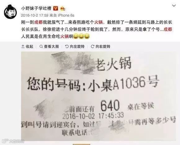 “排队难,难于上青天”“外地人到成都必打卡火锅店”“朋友圈炫耀神器”… 小龙坎火锅创造的排队神话,一点都不亚于茶饮届的喜茶。其中,微博著名大V“小野妹子学吐槽”的两次小龙坎经历也是不忍直视。