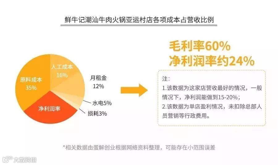 3、对供应链要求很高。牛肉火锅吃的是鲜,要求当天宰杀,不冷冻,6小时内送到餐桌上,配送是一个问题。在潮汕,很多牛肉火锅店直接开在屠宰场附近。牛肉火锅对肉的部位也有要求,一只牛只有37%的肉适合涮火锅,余下的部分如何处理是个难题。这些都很考验对供应链的把控能力。而且很多新增门店多是单店,单店采购,对供应链的议价能力很弱。