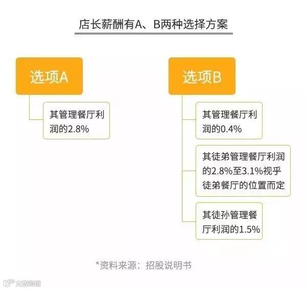 4、师徒制,师傅所在门店为小组组长,各门店的绩效与小组内其他门店挂钩。对徒弟的考核也与师傅的门店挂钩,徒弟能不能开新店或成为店长,都会影响师傅的绩效。店长收入与火锅店的利润挂钩,按月营收500万,净利润9.7%的店来算,按选项A的薪酬制度,店长一个月薪酬达到1.3万。如果按选项B来算,分成比例高得多,所以这种制度下店长也会积极发展徒弟。