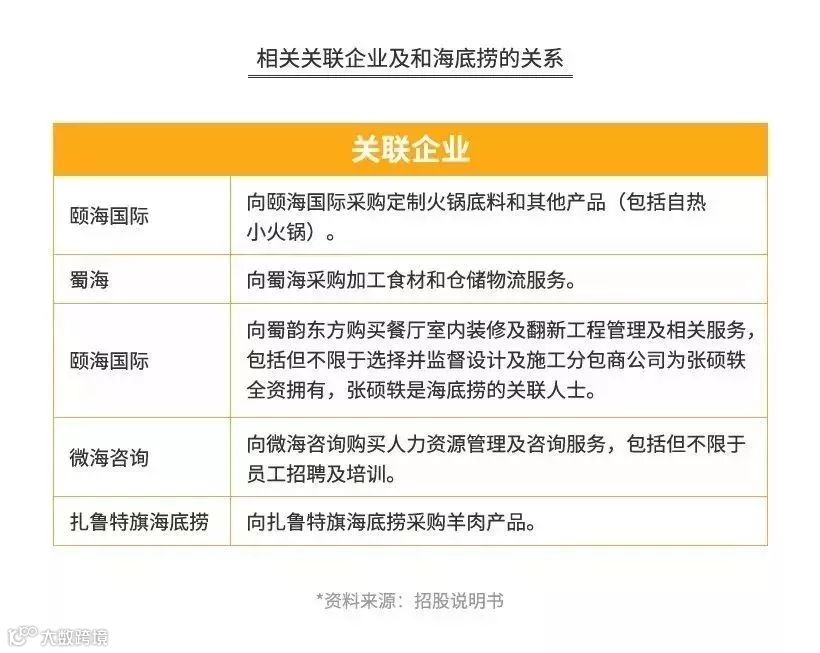 海底捞涉足了整个火锅产业链的上游,包括食材供应、底料供应、人力资源、装修等,每一环节都成立了公司独立运作。并且这些供应链公司都对外开放,向其他公司提供服务,海底捞餐厅只是供应链公司合作方之一。比如火锅底料供应商颐海国际,早于海底捞在港股上市,颐海国际只有50%的收入来自于海底捞关联交易。