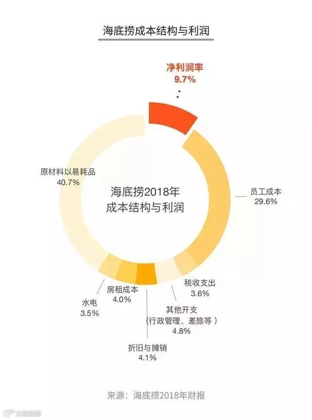 在海底捞的成本结构中,员工成本占到29.6%。而一般的火锅店人工成本会控制在15%—20%。海底捞一家店员工人数在150人左右,光员工住宿成本,一家店一年就高达50万。而一般一家1000平米的火锅店,员工人数只有三五十人。