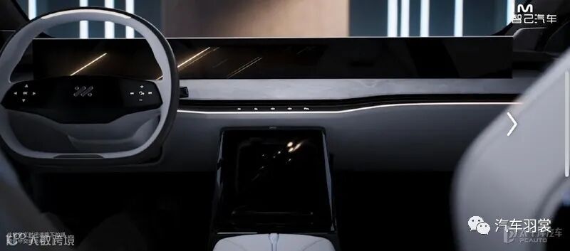 新车内饰设计十分科幻、简洁,中控采用一体式设计。方向盘造型十分独特,并搭配了车内贯通融合的39’Incell巨幅显示大屏,可根据使用场景进行智慧分屏升降。12.8’的2KAMOLED曲面智控中枢屏,内置智己汽车全球首创无界交互IMOS操作系统。