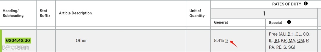 进入网站后,在“Search the Current HTS”输入相关货物的HTS编码或产品英文名称。我们以6204.42.30(棉质灯心绒梭织连衣裙产品)为例查询,查看“General”栏的基础税率,General税率是8.4%,那么也就是这个HTS下基础的税率是8.4%。