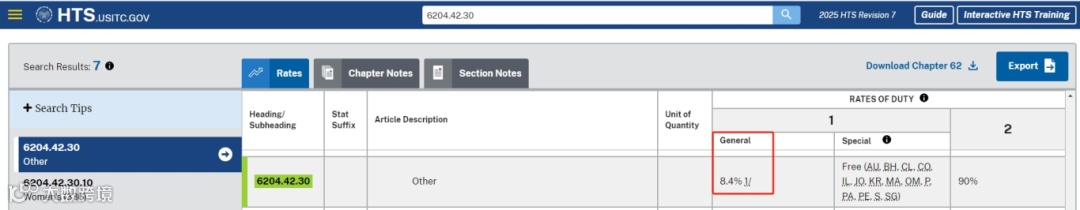 注意:美国对中国的加征关税(如301、233关税以及芬太尼关税、对等关税等)通常不在“general”栏直接显示,而是通过单独章节(如HTS第99章)或附加代码标注。