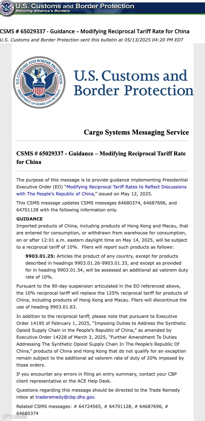 先来看下美国海关最新发布的公告:自美东时间2025年5月14日凌晨0点01分起(北京时间5月14日中午12 点01分),进口自中国(包括香港和澳门)且用于消费或从仓库中提取用于消费的产品,将被征收 10% 的对等关税。