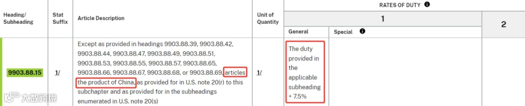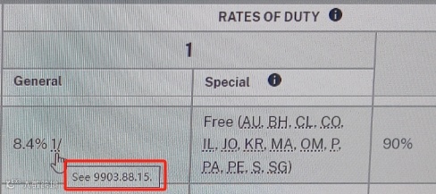 当我们把鼠标指针移到这个“1”和“/”地方时,会跳出一个提示:see 9903.88.15,即指示我们需要再去查看9903.88.15这个代码下的内容。