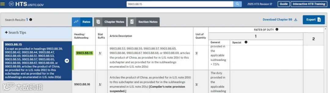 这里我们复制这个9903.88.15编码(也就是第99章的关税附加章节)在搜索板块进行查询,得到如下页面。