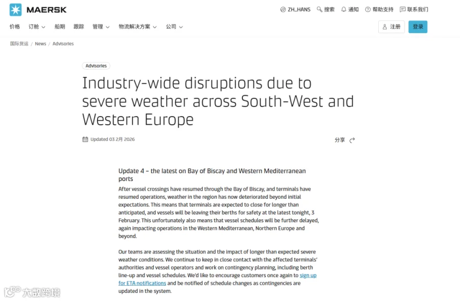 航运公司与物流运营商普遍认为,本轮事件已经不再是单一地区的天气影响,而是一场覆盖多区域、多运输方式的行业级中断,对欧洲供应链稳定性形成明显压力。