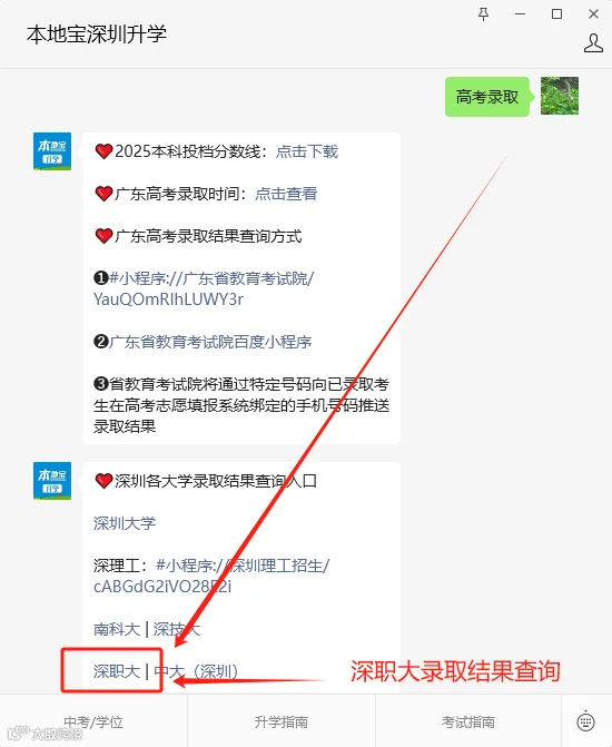 或者长按下方二维码,进入【本地宝深圳升学】回复【高考录取】查询录取结果、以及录取通知书的物流状态等