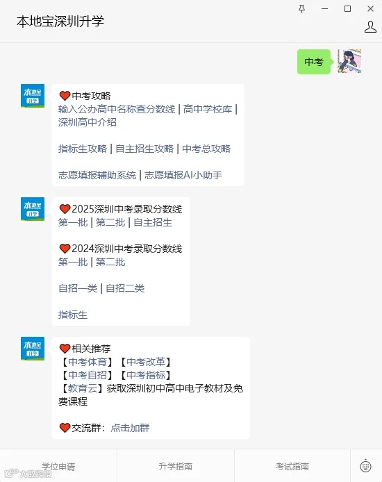 在深圳招考网,或者长按下方二维码,进入【本地宝深圳升学】回复【中考】获取深圳中考指南、往年分数线、自主招生+指标生攻略等