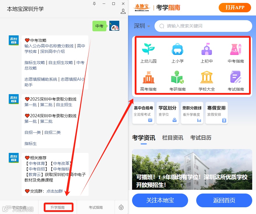 长按下方二维码,进入【本地宝深圳升学】,菜单栏点击【升学指南】获取深圳幼儿园入园、幼升小、小升初、中考高考等升学攻略