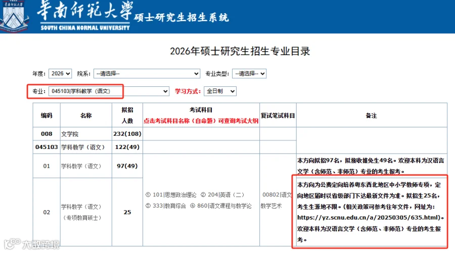 据华南师范大学2026年硕士研究生招生专业目录,华师2026年在学科教学(语文)、学科教学(数学)、学科教学(物理)、学科教学(化学)、学科教学(生物)、学科教学(英语)、学科教学(思政)、学科教学(历史)、学科教学(地理)9个专业,共有190个公费定向培养粤东西北地区中小学教师专项计划。