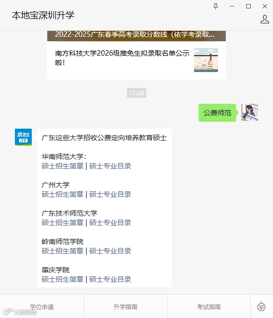 在各大学研究生招生网,或者长按下方二维码,关注【本地宝深圳升学】回复【公费师范】获取广东开展公费师范硕士招生大学的招生简章和专业目录