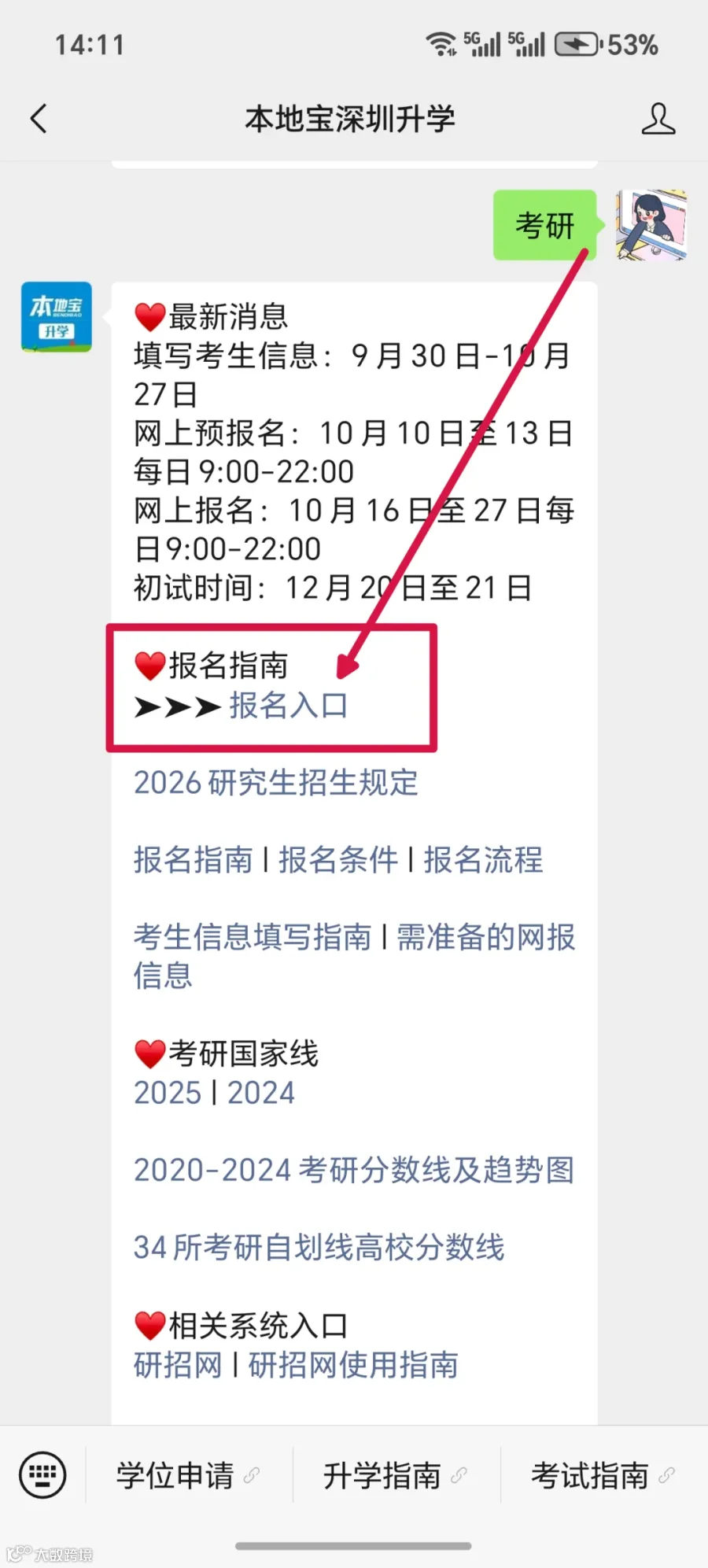 或者长按下方二维码,关注【本地宝深圳升学】回复【考研】按照下图指引进入研招网报名入口、获取报名指南、考研分数线、后续网上确认等最新消息