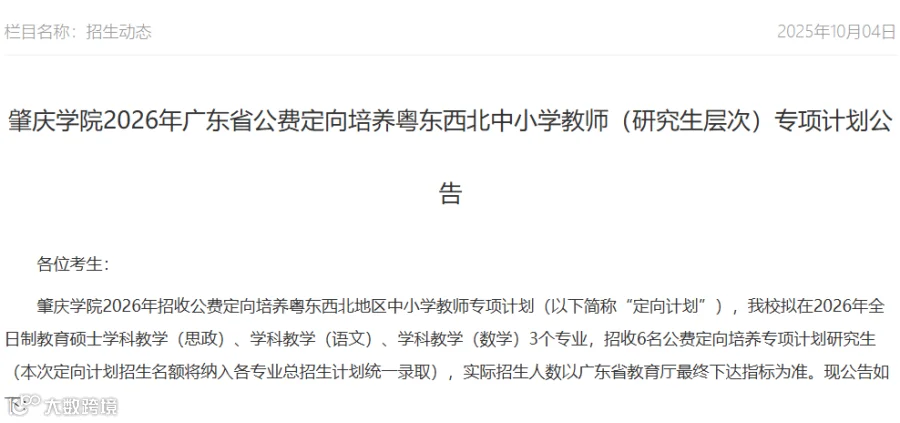 肇庆学院2026年招收公费定向培养粤东西北地区中小学教师专项计划,学校拟在2026年全日制教育硕士学科教学(思政)、学科教学(语文)、学科教学(数学)3个专业,招收6名公费定向培养专项计划研究生(本次定向计划招生名额将纳入各专业总招生计划统一录取),实际招生人数以广东省教育厅最终下达指标为准。