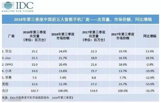 目前在2018年第三季度国内手机市场出货量排名前五位的榜单中,早已经没有了朵唯的身影,而是被归到了“其他”当中。